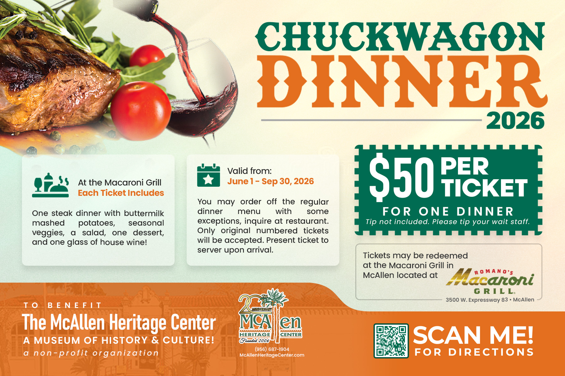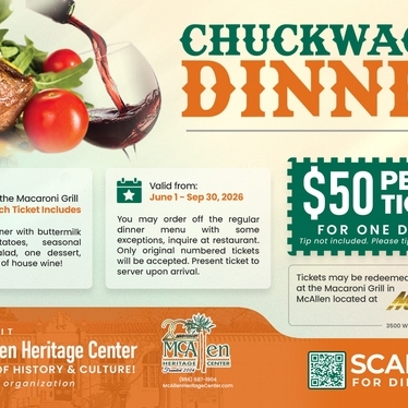 Please support our annual dinner ticket fundraiser! This year, we will continue to offer the popular dinner for two at Macaroni Grill for $80 BUT we are also adding a Single dinner ticket for $50. Scan the QR code to buy your ticket online or buy at the museum during operating hours. All MHC board members and staff will be selling tickets. Call us at 956-681-2860